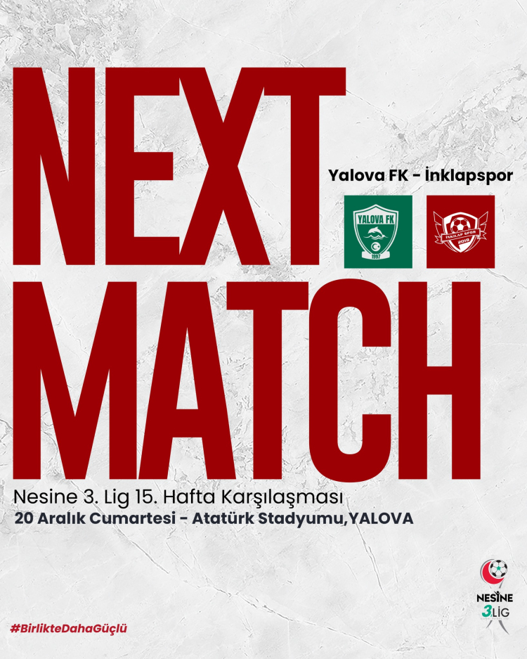Türkiye Nesine 3.Lig temsilcimiz Yalova FK, 15.hafta mücadeleleri kapsamında iç sahada İnkılapspor ile kozlarını paylaşacak. Yalova FK üst sıralara yükselmek, İnkılapspor ise küme düşme hattından uzaklaşmak adına, galibiyet parolasıyla sahaya çıkacak.