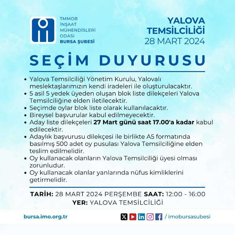 İnşaat Mühendisleri Odası Bursa Şubesine bağlı olan İnşaat Mühendisleri Odası Yalova Temsilciliği, 28 Mart Perşembe günü saat 12:00 ile 16:00 arasında Yalova Temsilciliğinde gerçekleştirilecek olan seçimle yeni yönetim kurulunu belirleyeceğini duyurdu.