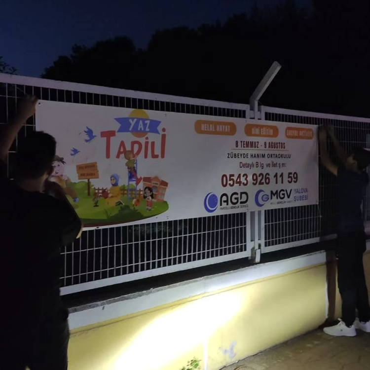 8 Temmuz ile 9 Ağustos 2024 tarihleri arasında Zübeyde Hanım Ortaokulunda yapılacak etkinlikler: Helal hayat, dini eğitim ve sosyal aktivite başlıkları altında toplandı. Yaz etkinliklerinin, gençlerin AGD ideallerine sımsıkı sarılıp aynı hedeflere kilitlenmeleri için birliktelik inşa edeceği bir çalışma olduğunu vurgulayan Anadolu Gençlik Derneği Yalova Şubesi üyeleri, Yalova’nın çeşitli noktalarına tanıtım pankartlarını yerleştirdi.
