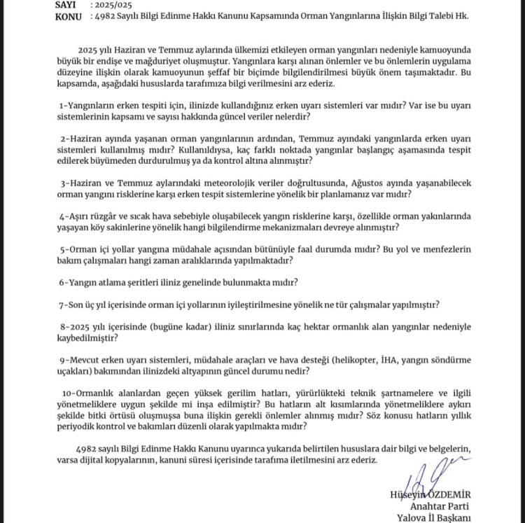 Anahtar Parti Yalova İl Başkanı Hüseyin Özdemir imzalı dilekçede, “2025 yılı Haziran ve Temmuz aylarında ülkemizi etkileyen orman yangınları nedeniyle kamuoyunda büyük bir endişe ve mağduriyet oluşmuştur. Yangınlara karşı alınan önlemler ve bu önlemlerin uygulama düzeyine ilişkin olarak kamuoyunun şeffaf bir biçimde bilgilendirilmesi büyük önem taşımaktadır. Bu kapsamda, aşağıdaki hususlarda tarafımıza bilgi verilmesini arz ederiz.