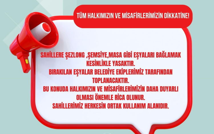 Belediyenin yaptığı uyarılarda, ‘’Vatandaşlarımızın dikkatine, sahillere şezlong, şemsiye, masa, gibi eşyaları bağlamak kesinlikle yasaktır. Bırakılan eşyalar belediye ekiplerimiz tarafından toplanacaktır. Bu konuda halkımızın ve misafirlerimizin daha duyarlı olması önemle rica olunur, sahillerimiz herkesin ortak kullanım alanlarıdır’’ ifadelerine yer verdi.