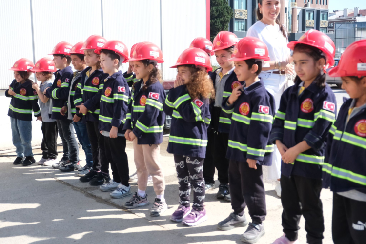 Ziyarette itfaiye üniforması giyerek renkli görüntüler de oluşturan çocuklar, kendileri için hazırlanan ‘minik itfaiye aracını’ kullandı.