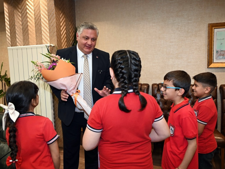 Ziyaret sırasında Başkan Gürel’e çiçek sunan öğrenciler, 23 Nisan’a özel hazırladıkları dilek ve taleplerini de ilettiler.