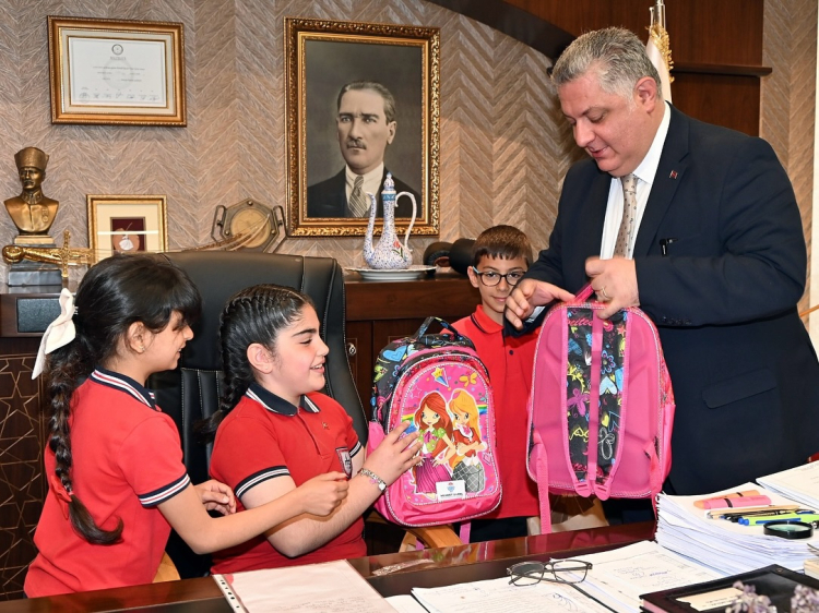 Yalova Belediye Başkanı Mehmet Gürel de öğrencilere okul çantası hediye ederek öğretmen ve okul yöneticileri ile bir süre daha istişarede bulundu.