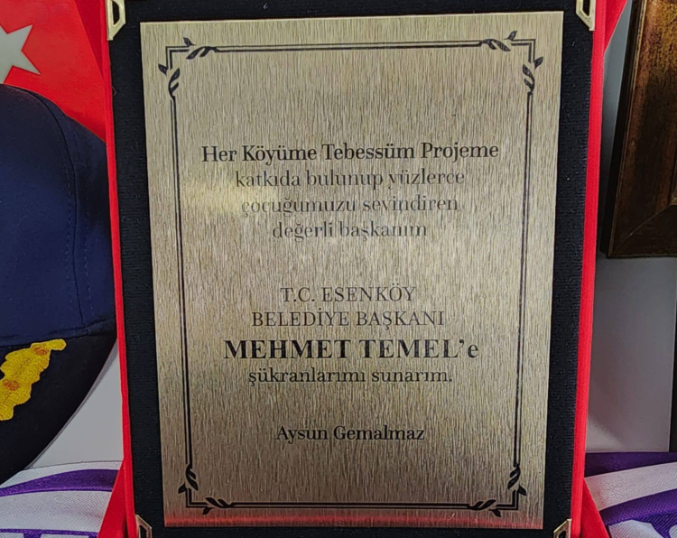 “Her Köyüme Tebessüm” projesi kapsamında sanatıyla projeye değer katan Filografi sanatçısı Aysun Gemalmaz, katkılarından dolayı Esenköy Belediye Başkanı Mehmet Temel’e teşekkür plaketi takdim etti. Gemalmaz aynı zamanda da, kadın emeğini desteklemek adına kurulan *"Üreten Ev Kadınları Pazar"ında kendisine stant imkânı sağlandığı için de Başkan Temel’e ayrıca teşekkür etti. Başkan Temel ise nazik plaketten dolayı memnuniyetini dile getirerek, “Toplum yararına yapılan her çalışmanın yanında olduk, olmaya da devam edeceğiz. Aysun Hanım’a bu duyarlı davranışı için teşekkür ediyorum,” dedi.