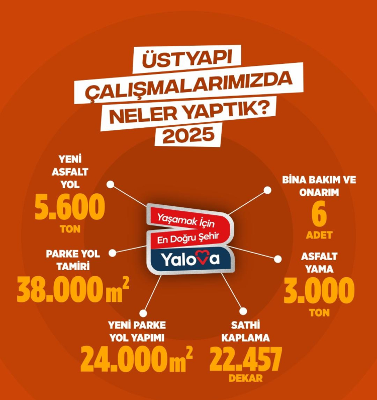 Yalova Belediyesi, 2025 yılı boyunca kent genelinde yürüttüğü üstyapı çalışmalarıyla yolları daha güvenli, konforlu ve modern hale getirdi. Paylaşılan verilere göre yıl boyunca asfalt, parke yol ve bakım-onarım çalışmalarında önemli rakamlara ulaşıldı