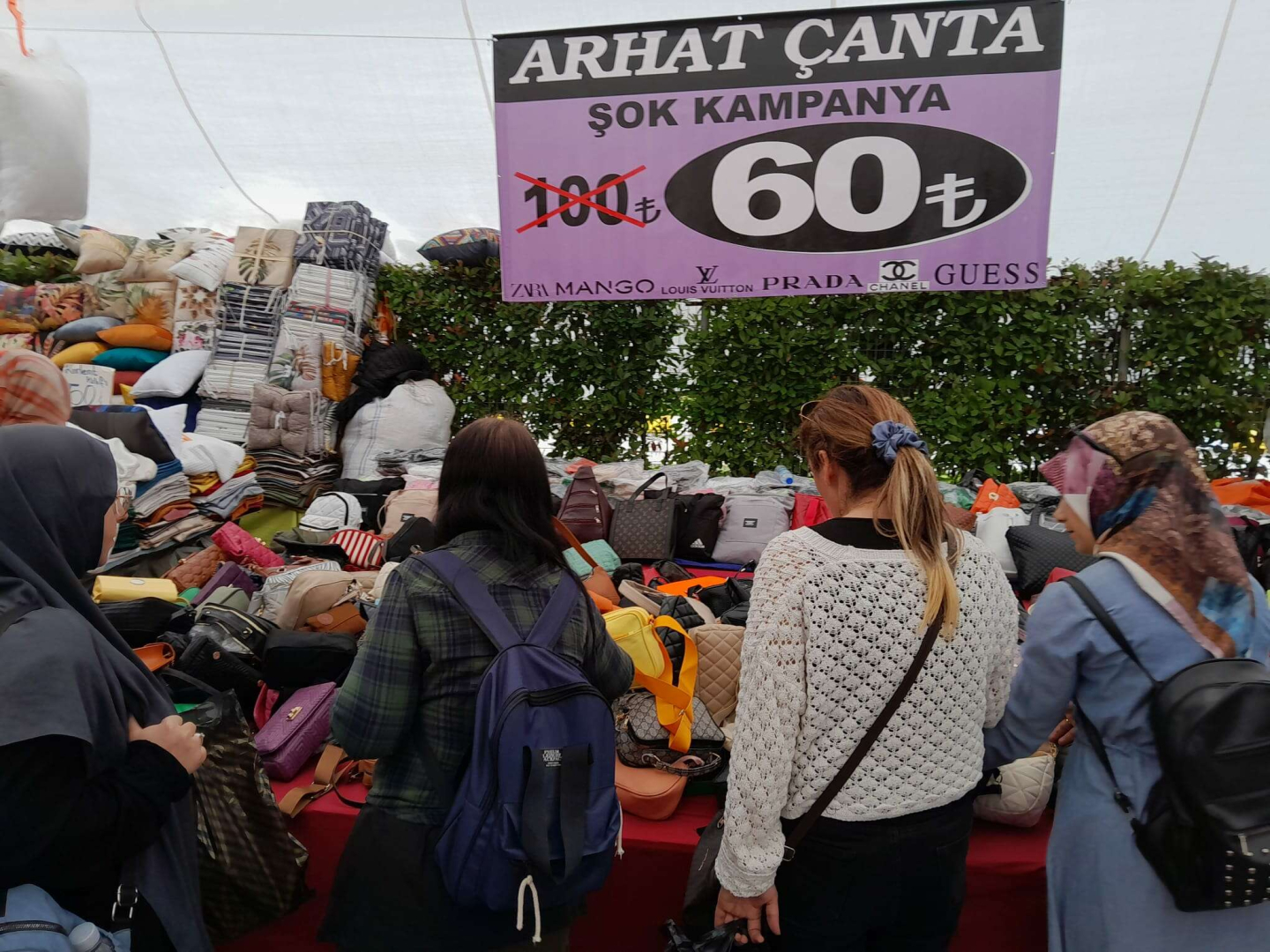 Her Pazartesi günü Çiftlikköy’de kurulan Sosyete Pazarı, özellikle giysi, takı, iç çamaşırı, pantolon, çorap gibi ürünleriyle vatandaşların ilgisini çekmeye devam ediyor. Tezgahlarda yer alan ayakkabı ve çantalara da taleplerde artış gözlemlendi. Sosyete Pazarı’nda çantalar 50-60 TL, ayakkabılar 200 TL’den başlayan fiyatlar ile satışa sunuluyor. Defolu ürünlerin tüketiciye sunulduğu tezgahlarda vatandaşlar bütçesine göre ürün alabiliyor.