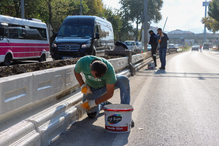 Yapılan çalışmalarda, refüj bordürleri özenle boyanarak caddeye daha düzenli ve estetik bir görünüm kazandırılıyor.