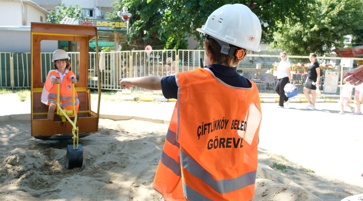 Çiftlikköy Belediyesi Park ve Bahçeler Müdürlüğü’nün kaynak atölyesi ustaları tarafından hurdaya çıkarılan park malzemelerinden üretilen oyuncak kepçe, miniklerin de büyük eğlencesi oluyor.