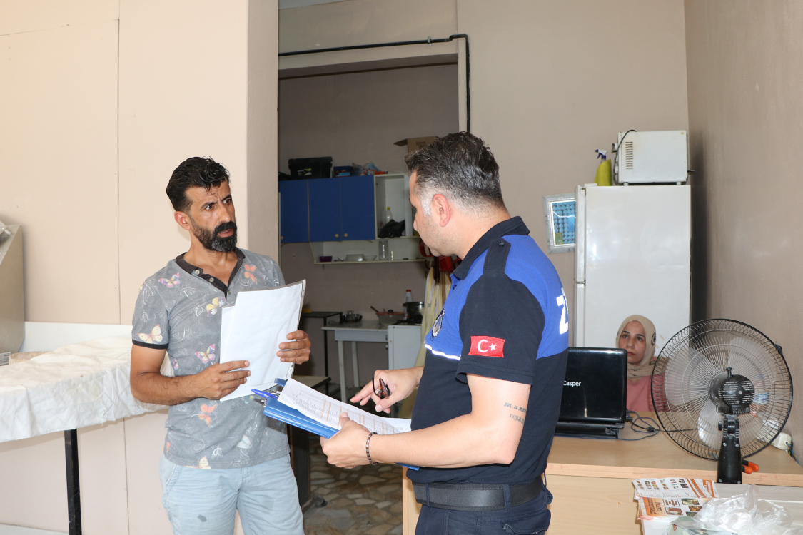 Zabıta ekipleri, ilçe genelinde hizmet standartları kapsamında işyerlerinin ilgili yönetmeliklerde belirtilen kriterlere uygunluğunu kontrol ederek, ruhsatsız işletme sahiplerine uyarılarda bulunuyor.