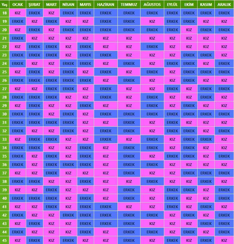 Anne adayının yaşını ve gebe kaldığı ayı belirledikten sonra, Çin takvimini kullanarak bebek cinsiyetini belirleyebilirsiniz. İşte Çin takvimi ile bebek cinsiyeti hesaplama tablosu: