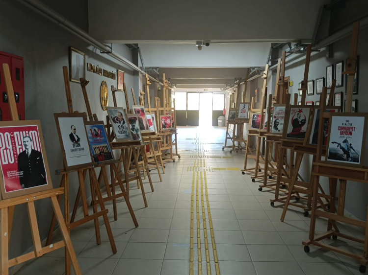 Okul koridorunda resim bölümü öğrencilerinin hazırladığı Cumhuriyet Bayramı temalı resim sergisinin açılışını Okul Müdürü Haydar Kılıç yaptı. Velilerin ve öğrencilerin sergi gezisinin devamında konferans salonunda kutlama programına geçildi.