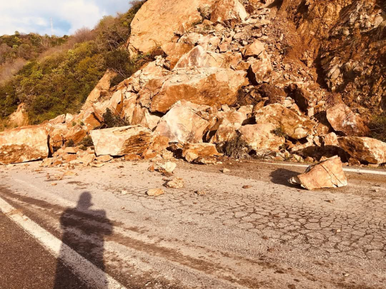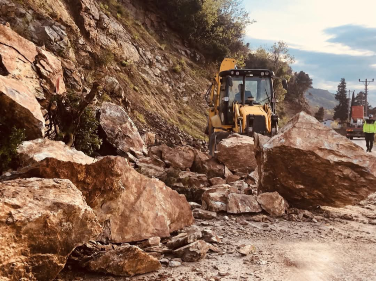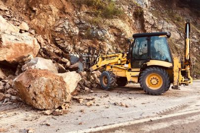 Tonlarca ağırlığında dev kayalar toprakla birlikte kayarak yolu kapattı.