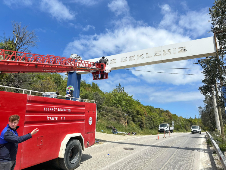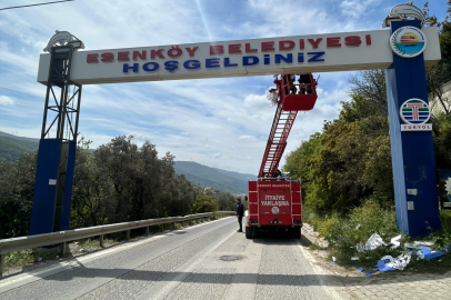 Esenköy Beldesinin girişinde bulunan dev tabelada zabıta ve itfaiye ekiplerinin gözetiminde tamirat ve elektrik bağlantı çalışmaları yürütülüyor. Esenköy Belediyesi sürücüleri dikkatli olmaları yönünde uyardı.