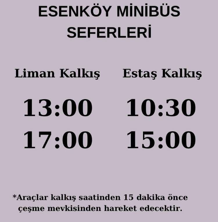 Liman kalkış: 13.00, 17.00 ve Estaş kalkış: 10.30, 15.00 saatlerini kapsıyor. Araçlar kalkış saatinden 15 dakika önce çeşme mevkiinden hareket ediyor.