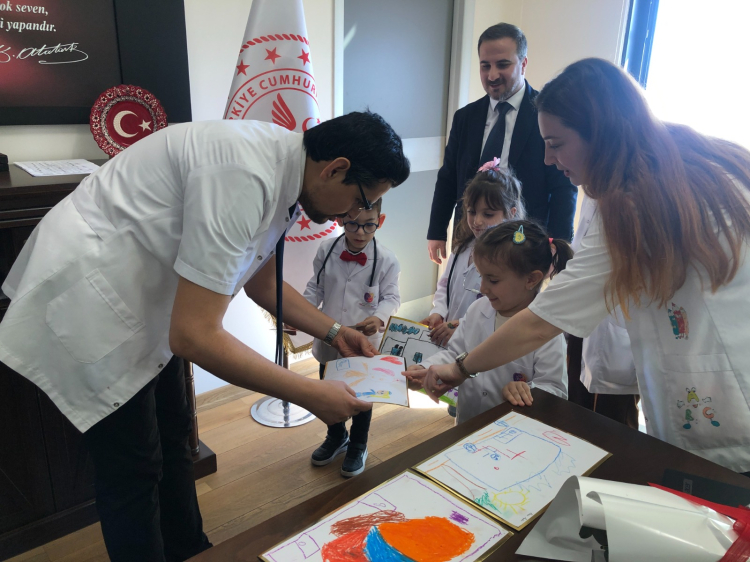 Minik öğrenciler, kendi emekleriyle hazırladıkları resimleri Başhekim Doç. Dr. Hasan Ergenç’e takdim ederek, Tıp Bayramı’nı kutladı.