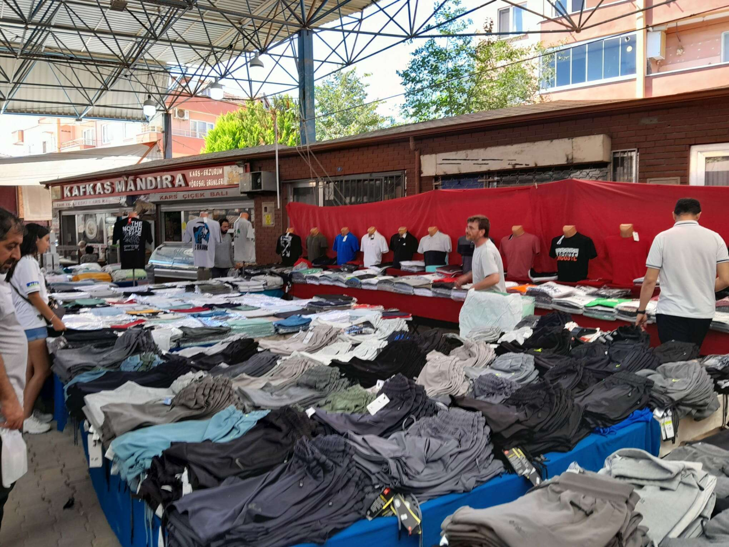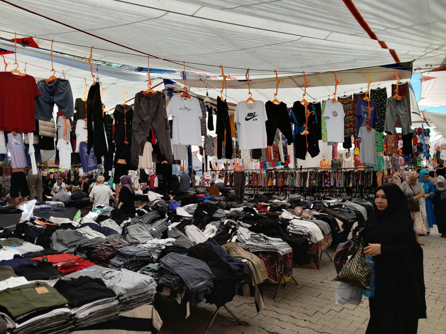 Yalova’nın Çiftlikköy ilçesinde her pazartesi günü kurulan Sosyete Pazarı, giysi, ayakkabı başta olmak üzere birçok ürünü tezgahlarında bulundurarak vatandaşların ilgisini çekmeye devam ediyor. Tezgahlardaki ürünlere Kurban Bayramı’ndan sonra zam geldiğini ifade eden pazar esnafları satışların fazla olmadığına dikkat çekti. Sosyete Pazarı’nda erkek-kadın tişörtleri 100-150 TL, çocuk kıyafeti (takım) 100 TL, pantolonlar 150 TL, kadın elbiseleri 100-350 TL, erkek eşofman takımı 750 TL, ayakkabılar 300 TL, terlikler 40-170 TL, çantalar 70 TL’den başlayan fiyatlar ile satışa sunuluyor.