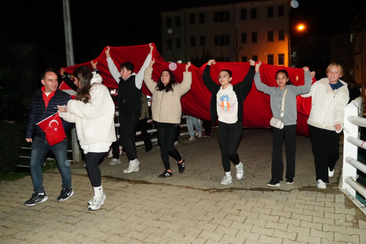 Kaymakamlık önünden başlayan fener alayında gençler ellerindeki devasa Türk bayrağını taşıdılar. Korteje katılamayan vatandaşlar ise korteje katılanları evlerinin balkonlarından alkışları ile selamlayarak destek verdiler.