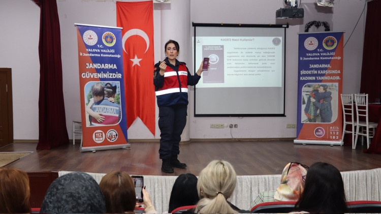 Yalova İl Jandarma Komutanlığı, Çiftlikköy Kültür Merkezi’nde düzenlediği eğitimde kadınlara aile içi ve kadına yönelik şiddetle mücadele konusunda bilgi verdi. Eğitimde ayrıca KADES uygulamasının tanıtımı da yapıldı.