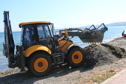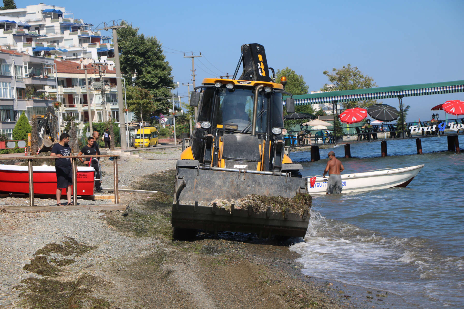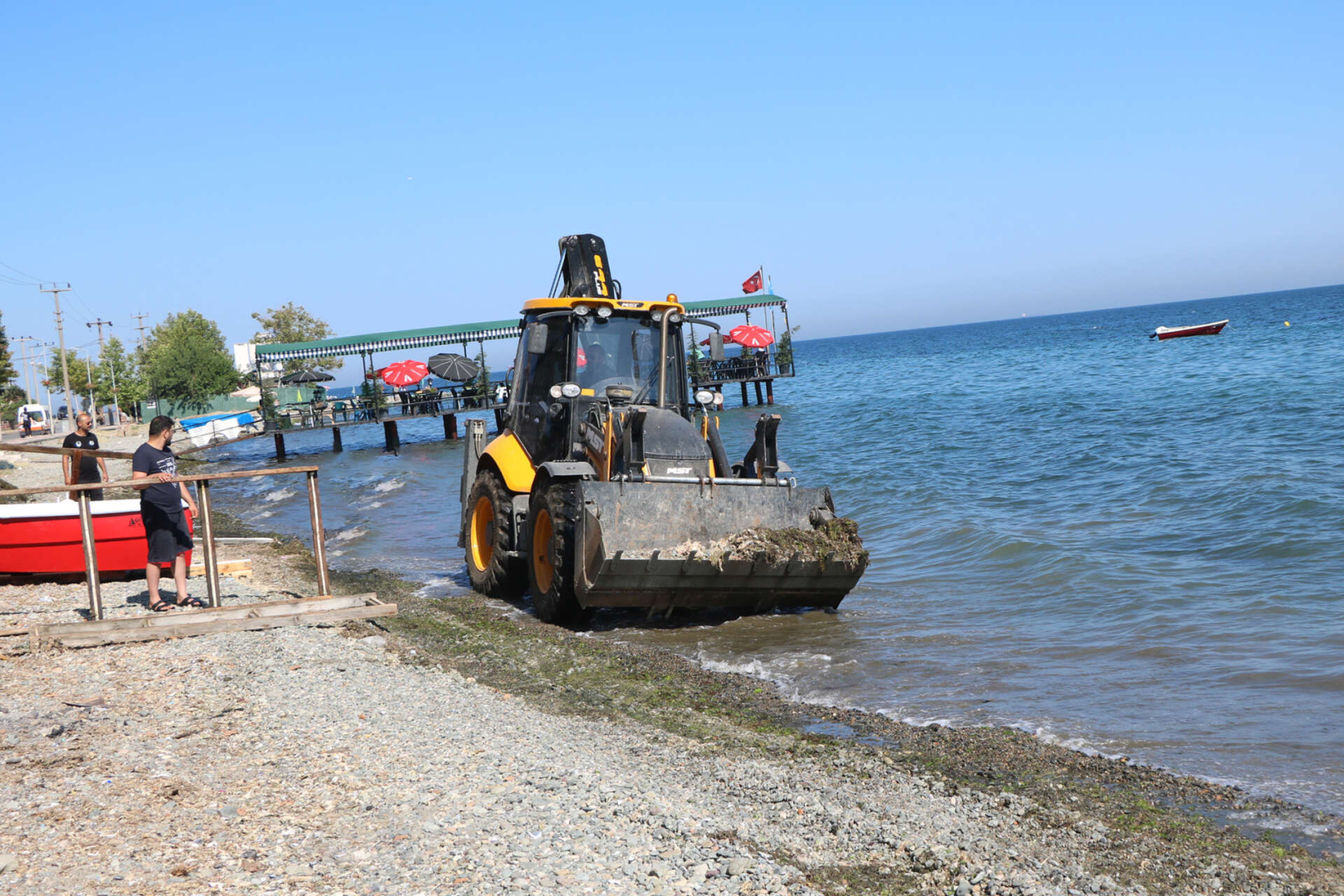 Belediye ekipleri Karpuzdere Mahallesi- Üçreisler Mevki sahil şeridinde biriken yosunları, loder kepçe ile toplayarak temizliyorlar. Kepçe ile toplanan yosunlar, kamyona yüklenerek sahil şeridinden uzaklaştırılıyor. Sahile vuran yosunlar temizlenirken aynı zamanda sahil hattının düzleştirilme çalışması da gerçekleştiriliyor.