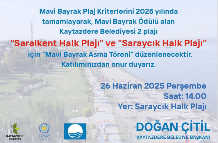 Kaytazdere Belediye Başkanı Doğan Çitil, tüm vatandaşları bu anlamlı törene davet etti. Konuyla ilgili açıklama yapan Başkan Çitil, “Mavi bayrak plaj kriterlerini 2025 yılında tamamlayarak, Mavi Bayrak ödülü alan Kaytazdere Belediyesi 2 plajı “Saralkent Halk Plajı” ve “Saraycık Halk Plajı” için “Mavi Bayrak Asma Töreni” düzenlenecektir. 26 Haziran 2025 Perşembe günü saat:14.00’de “Saraycık Halk Plajı’nda” (İskele Yanı) “Mavi Bayrak Asma Töreni’ne tüm halkımız davetlidir, katılımınızdan onur duyarız” dedi.