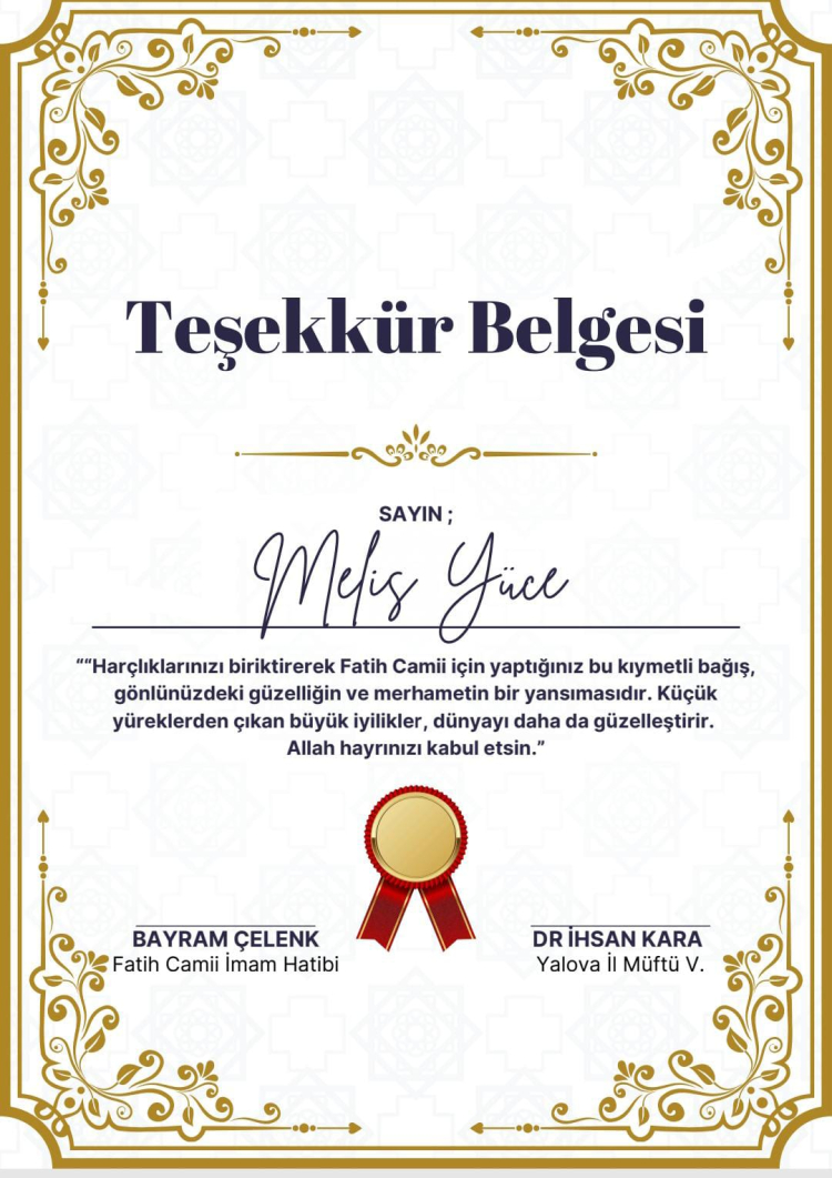 Eymen Korkmaz, Nil Azra Özaydın, Latife Binti Abdullah ve Melis Yücel, uzun süre boyunca biriktirdikleri harçlıklarını, Fatih Camii’nin ihtiyaçlarında kullanılmak üzere bağışladı. Minik bağışçılara, cami imamı ve il müftüsü tarafından özel olarak hazırlanmış Teşekkür Belgeleri takdim edildi. Fatih Camii İmam Hatibi Bayram Çelenk ve Yalova İl Müftü Vekili Dr. İhsan Kara tarafından imzalanan belgelerde şu ifadelere yer verildi: