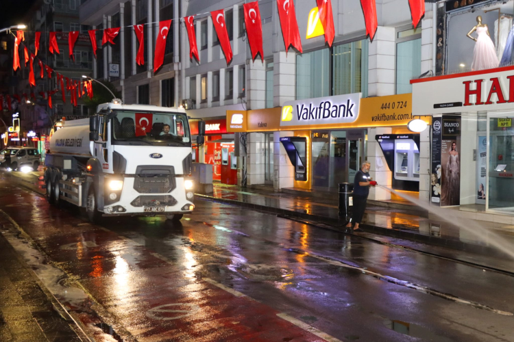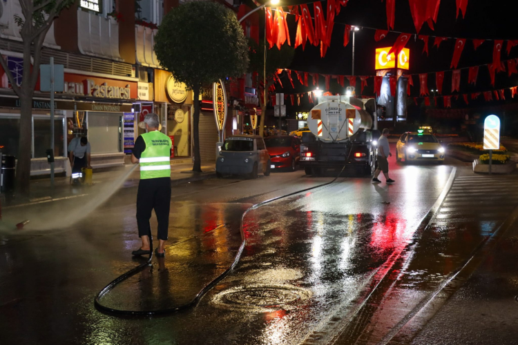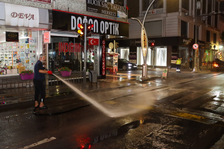 Mesai mefhumu gözetmeksizin gerçekleştirilen temizlik mesaisinde, şehrin kalbi olarak bilinen Cumhuriyet ve Yalı Caddesi’nde, yollar sabunla köpürtülerek fırçalandı ve tazyikli suyla yıkandı.