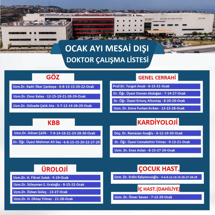 Ocak ayı boyunca hizmet verecek branşlar ve doktorların çalışma programı şu şekilde belirlendi: Göz Hastalıkları polikliniğinde; Uzm. Dr. Kadir İlker Çankaya 6, 8, 13, 15, 20 ve 22 Ocak’ta, Uzm. Dr. Onur Kalay 12, 15, 19, 21, 28 ve 29 Ocak’ta, Uzm. Dr. Gülzade Çalık Ata ise 5, 7, 12, 14, 26 ve 29 Ocak tarihlerinde görev yapacak. Genel Cerrahi servisinde; Prof. Dr. Turgut Anuk 6, 15 ve 21 Ocak’ta, Dr. Öğr. Üyesi Osman Akdoğan 7, 14 ve 27 Ocak’ta, Dr. Öğr. Üyesi Ertunç Altuntaş 8, 20 ve 29 Ocak’ta, Uzm. Dr. Emre Furkan Kırkan ise 13, 22 ve 28 Ocak’ta hasta kabul edecek. Kulak Burun Boğaz (KBB) branşında; Uzm. Dr. Adnan Çelik 7, 9, 14, 16, 21, 23, 28 ve 30 Ocak tarihlerinde, Dr. Öğr. Üyesi Mehmet Ali Say ise 6, 8, 13, 15, 20, 22, 27 ve 29 Ocak tarihlerinde hizmet sunacak.