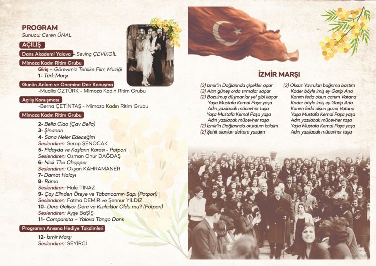 Sunuculuğunu Ceren Ünal’ın üstleneceği gecenin açılışı Dans Akademi Yalova’nın dans gösterisiyle yapılacak. Ardından Mimoza Kadın Ritim Grubu, “Görevimiz Tehlike” film müziğiyle sahneye giriş yaparak Türk Marşı’nı seslendirecek. Programın anlam ve önemine ilişkin konuşma Mualla Öztürk, açılış konuşması ise Berna Çetintaş tarafından yapılacak. Etkinlik kapsamında Mimoza Kadın Ritim Grubu; “Bella Ciao”, “Sana Neler Edeceğim”, “Fidayda”, “Ramo”, “Çay Elinden Öteye” ve “Dere Geliyor Dere” gibi birçok eseri izleyicilerle buluşturacak.