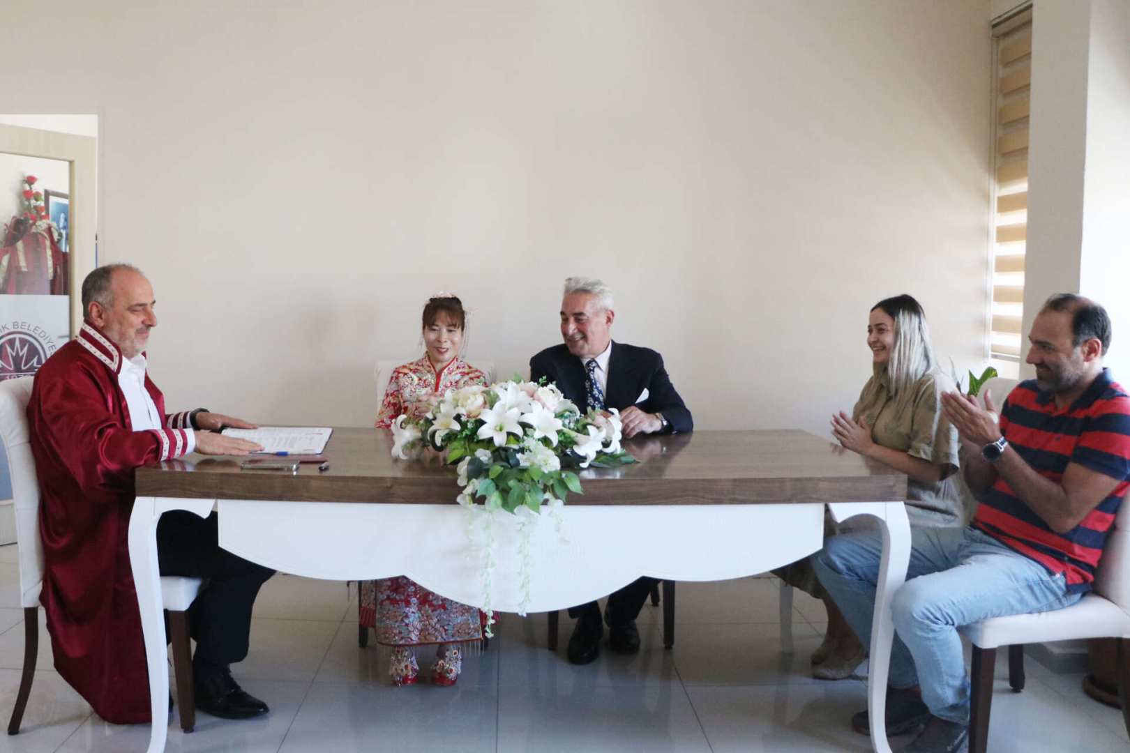 Soyer yeni evlenen çifte, "Sevginin sabır, sevginin sadakat, sevginin emek olduğunu hiçbir zaman unutmayın ve size ömür boyu mutluluklar dilerim" dedi ve evlilik cüzdanını Beuiao Ling'e teslim ederek, çifti tebrik etti.