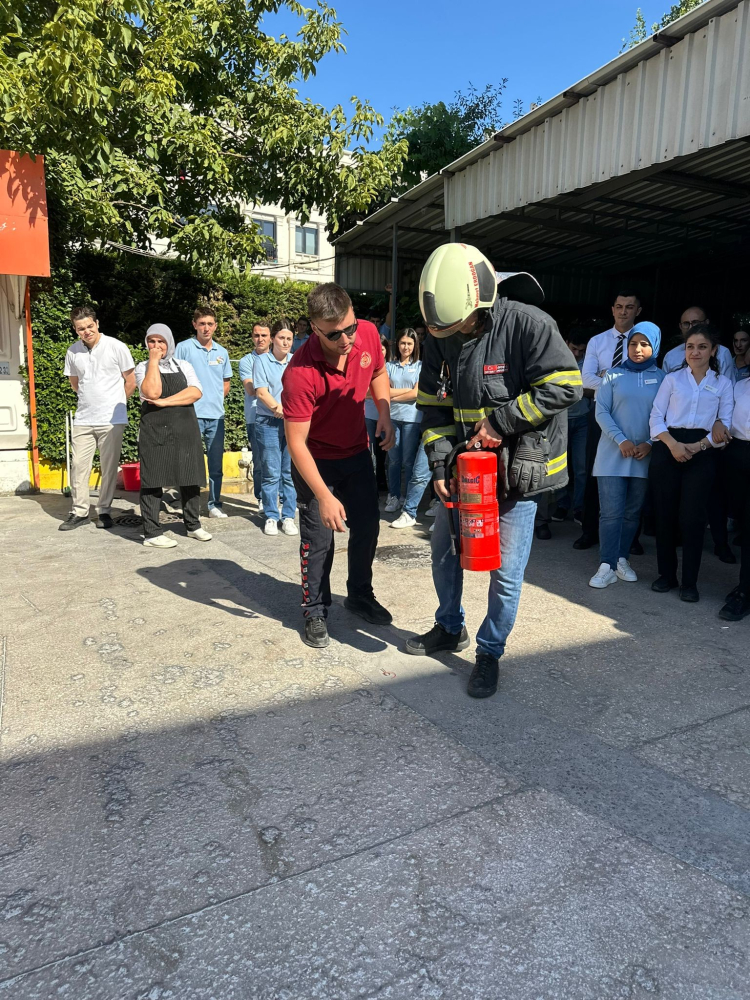 Programın ilk bölümünde itfaiye ekipleri tarafından yangın türleri, müdahale teknikleri, yangın söndürme tüplerinin etkin kullanımı ve güvenli tahliye yöntemleri hakkında teorik bilgiler verildi. Katılımcılara, toplu alanlarda yangınla mücadele prosedürleri ve acil durum reflekslerinin önemi aktarıldı.