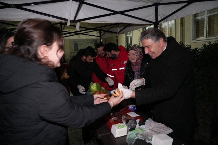 Yalova Üniversitesi Rektörü Prof. Dr. Mehmet Bahçekapılı, Kızılay Yalova Şubesi ile birlikte gece saatlerinde kütüphanede ders çalışan öğrencilere sucuk ekmek ikram etti.