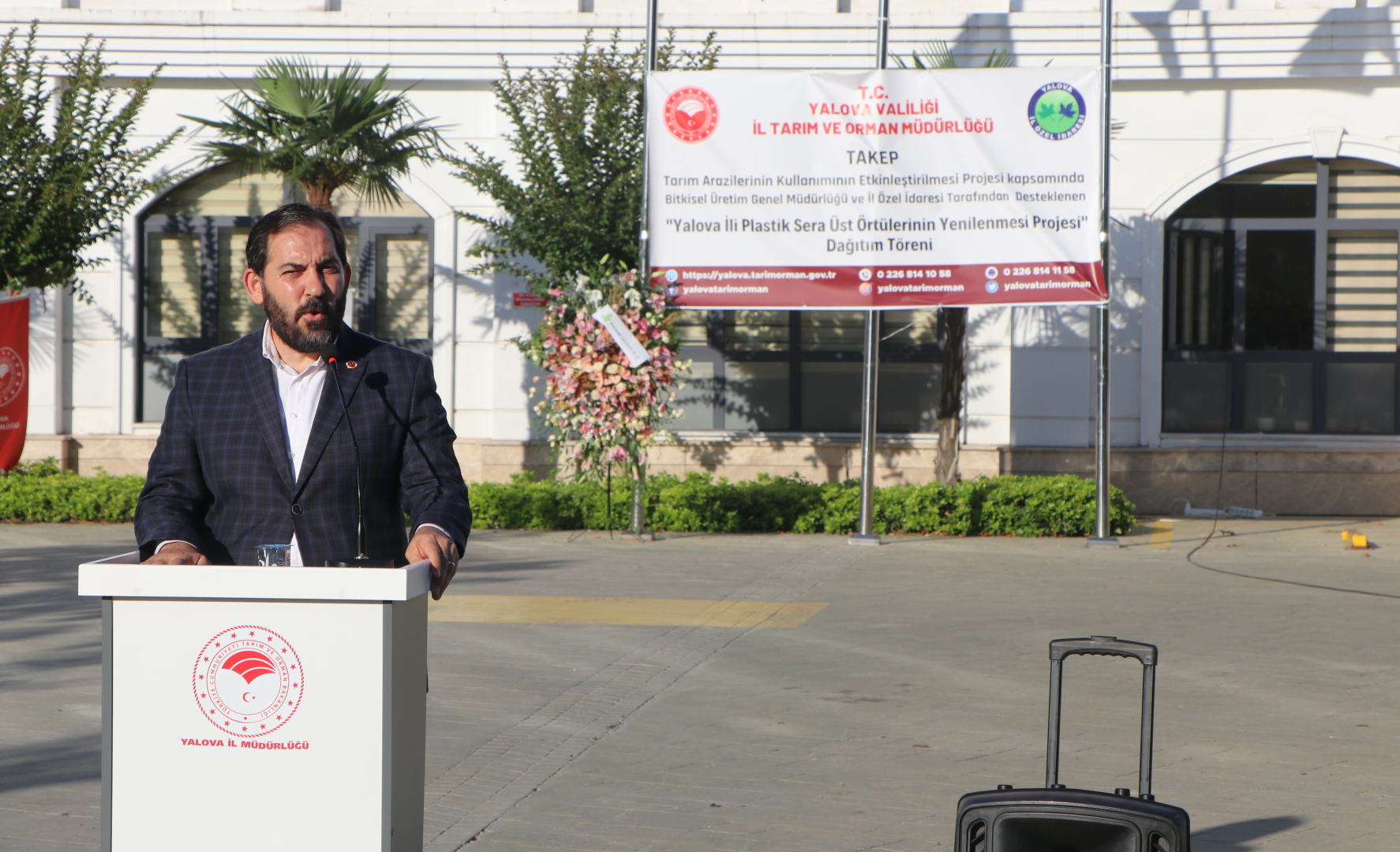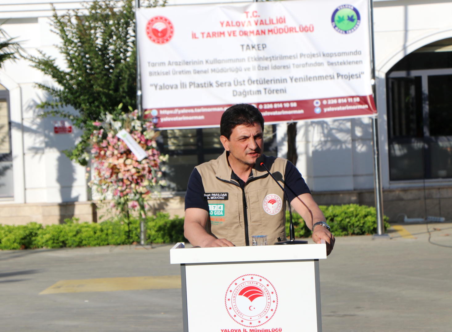 Yalova İl Tarım ve Orman Müdürü Suat Parıldar, dağıtılan sera örtülerinin önemine değinerek, “Bugün proje kapsamında plastik sera naylonu dağıtımını gerçekleştireceğiz. Kent tarımı yaklaşımı ile artan lojistik maliyetlerin olumsuz etkisini kırmak üzere büyük kentlerin sebze ihtiyacını yakın üretim havzalarından karşılamak hedefiyle, ilimizde örtüsüz, atıl durumdaki mevcut seraların ve işgücünün ekonomiye kazandırılması amacıyla Yalova’da modern seracılığı yaygınlaştırmak, yetiştiricileri katma değeri ve stratejik önemi yüksek tarımsal faaliyetlere yöneltmek amacıyla Yalova İli Plastik Sera Üst Örtülerinin Yenilenmesi Projesi hazırlanmıştır. İlimizde 3.820 dekar alanda örtü altı sebze üretimi yapılmaktadır. İlimizde üretim yapan işletme profilimizin büyük kısmı küçük aile işletmelerinden oluştuğu için kendi imkanları ile örtü değiştirmeleri ciddi bir maliyet oluşturmaktadır” dedi.