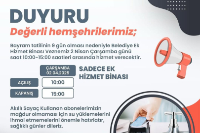 Belediyenin resmi sosyal medya hesapları üzerinden yapılan açıklamada, bayram tatilinin 9 gün olması nedeniyle Belediye Ek Hizmet Binası Veznesi'nin 2 Nisan Çarşamba günü saat 10:00-15:00 saatleri arasında hizmet vereceği belirtildi. Yapılan duyuruda, bayram tatili süresince sadece Ek Hizmet Binası Veznesi'nin açık olacağına dikkat çekilerek, diğer veznelerin kapalı olacağı vurgulandı. Vatandaşların mağduriyet yaşamaması için su yükleme işlemlerini belirtilen saatler arasında yapmaları rica edildi.