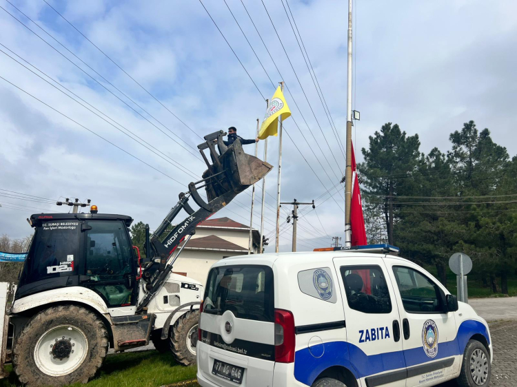 Türk bayrağına yakışan özeni gösteren zabıta ekipleri, belde genelinde bulunan bayrak direklerinde yer alan yıpranmış Türk Bayraklarını ve belediye bayraklarını yeniledi.