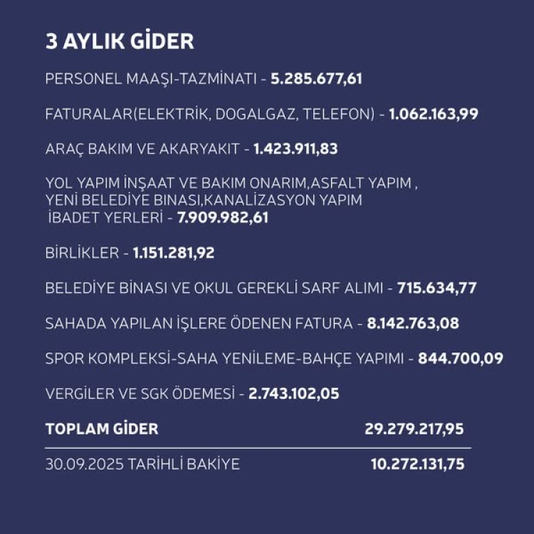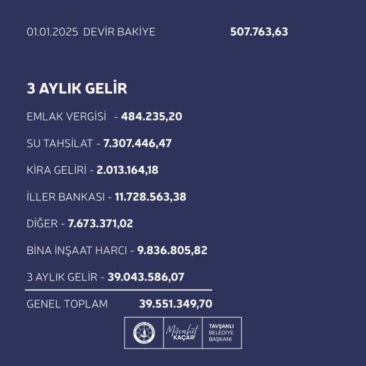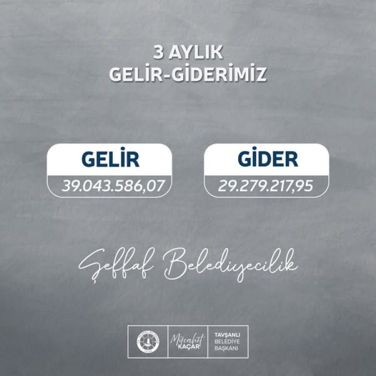Belediye, 2025 yılının ilk üç aylık dönemine ait gelir ve gider tablosunu kamuoyuyla paylaştı.