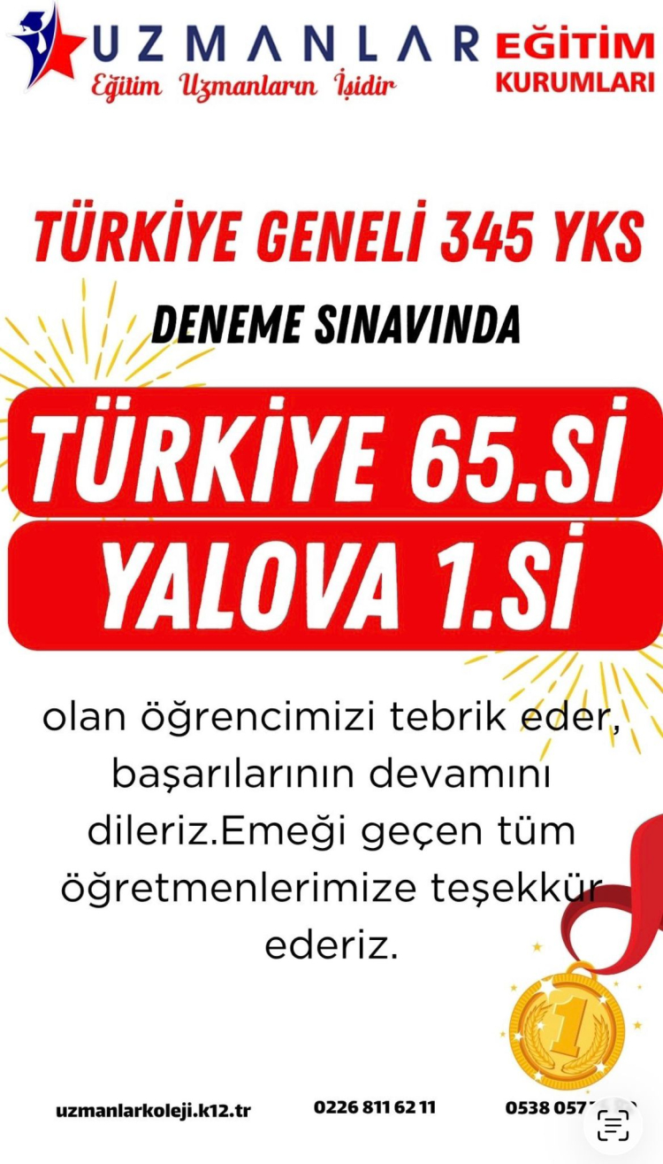 Uzmanlar Koleji Lisesi, 2025 Yükseköğretim Kurumları Sınavı (YKS) denemelerinde elde ettiği önemli bir dereceyle dikkat çekti. Türkiye genelinde yapılan deneme sınavında, okul öğrencilerinden biri Türkiye 65’incisi ve Yalova 1’incisi olma başarısını gösterdi.