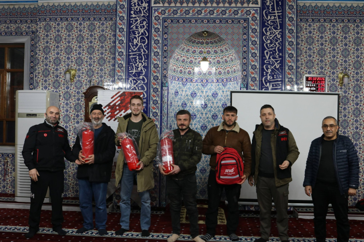 Eğitimin sonunda, farkındalığın artırılması amacıyla bazı katılımcılara yangın tüpü ve deprem çantası hediye edildi.