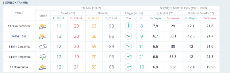 Hafta, 17 Ekim Cuma günü 21 derece ile kapanacak. Sıcaklık açısından haftanın zirve günü olan Cuma, parçalı bulutlu fakat genel olarak açık bir havayla geçecek. Geceleri ise sıcaklık 12 derece civarında seyredecek.
