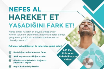 "Nefes Al, Hareket Et, Yaşadığını Fark Et!" sloganıyla hazırlanan görselde, kronik solunum problemi yaşayan bireylerin pulmoner rehabilitasyon ile yaşam kalitelerini artırabilecekleri vurgulanıyor. Pulmoner rehabilitasyon, kronik solunum yolu hastalıkları olan bireylerin (KOAH, astım, bronşektazi vb.) yaşam kalitesini artırmayı hedefleyen kapsamlı bir program. Bu program, solunum egzersizleri, eğitim, beslenme danışmanlığı ve psikososyal destek gibi unsurları içeriyor.