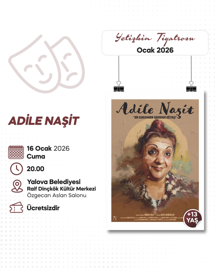 Tiyatro etkinlikleri, 16 Ocak Cuma günü ise “Adile Naşit-Bir Kahkahanın Ardındaki Gözyaşı” adlı oyunla devam edecek. Türk sinema ve tiyatro tarihinin simge isimlerinden Adile Naşit’in yaşam öyküsünü konu alan oyun, izleyiciyi sanatçının gülen yüzünün ardında saklı kalan kırılgan dünyasıyla buluştururken, bir dönemin sıcaklığını ve sahne arkasındaki yalnızlığını etkileyici bir sahne diliyle aktarıyor. Tek perdeden oluşan ve 70 dakika süren oyun, yalnızca bir tiyatro gösterimi değil; bir dönemin hafızasını, bir annenin şefkatini ve bir sanatçının içsel yolculuğunu anlatan güçlü bir bellek çalışması olarak öne çıkıyor. Yalova Belediyesi Kültür, Sanat ve Sosyal İşler Müdürlüğü tarafından düzenlenen her iki tiyatro etkinliğine katılım rezervasyonla sağlanacak. Tiyatroseverler, yalova.bel.tr adresi üzerinden rezervasyon yaptırarak etkinliklere katılabilecek.