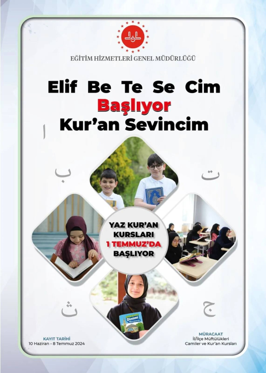 Diyanet İşleri Başkanlığı tarafından her yıl yaz tatili süresince camilerde ve Kur’an Kurslarında açılan ve milyonlarca öğrenciye hitap eden Yaz Kur’an Kursları bu yıl 1 Temmuz 2024 tarihinde eğitime başlayacak. Gündüzlü olarak 7 haftalık tek dönem halinde uygulanacak eğitim 01 Temmuz-16 Ağustos 2024 tarihleri arasında olacak.