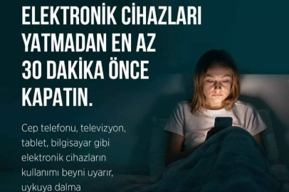 Yalova İl Sağlık Müdürlüğü, elektronik cihazları yatmadan en az 30 dakika önce kapatılması gerektiğini vurguladı. Yapılan yazılı açıklamada, cep telefonu, televizyon, tablet, bilgisayar gibi elektronik cihazların kullanımının beyni uyardığı, uykuya dalma süresini uzattığı ifade edildi. Açıklamada, elektronik cihazları yatmadan en az 30 dakika önce kapatılması gerektiğinin altı çizildi. Yalova İl Sağlık Müdürlüğü bu konuda herkesin dikkatli olması gerektiğini dile getirdi.