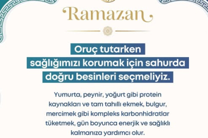 Açıklamada, oruç tutarken sağlığı korumak için sahurda doğru besinlerin seçilmesi gerektiği belirtildi. Bu kapsamda, yumurta, peynir, yoğurt gibi protein kaynakları ile tam tahıllı ekmek, bulgur, mercimek gibi kompleks karbonhidratların tüketilmesi önerildi. Bu besinlerin, gün boyunca enerjik ve sağlıklı kalmaya yardımcı olacağı ifade edildi.