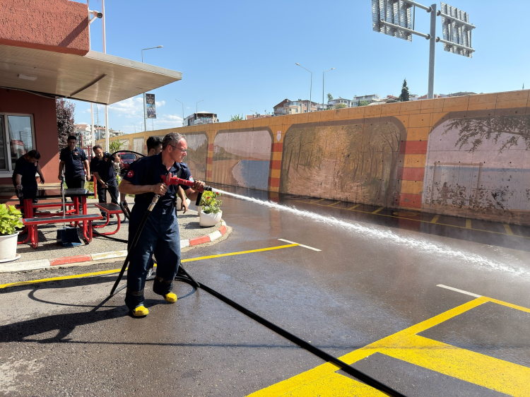 İstasyonun garaj bölümü detaylı şekilde temizlenirken, günlük sabah rutin tüm araçların kontrol ve bakımları haricinde, haftalık plana göre bir araç detaylı temizlik ve bakım için öne alınıyor. Araçların dış yüzeyi basınçlı suyla yıkanarak kir ve kurumdan arındırılıyor. Aynı zamanda iç bölmeler, ekipman dolapları ve hortum alanları hijyen koşullarına uygun şekilde dezenfekte ediliyor.