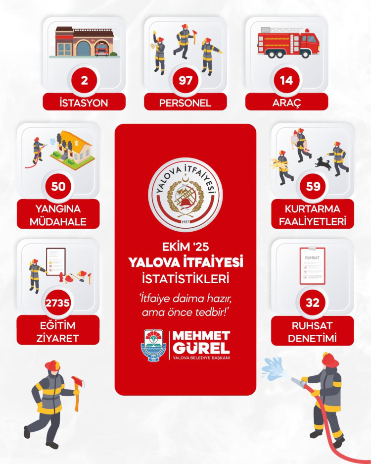 Yalova Belediyesi İtfaiye Müdürlüğü, Eylül ayında yürüttüğü faaliyetlerle ilgili rapor yayımladı. Raporda “Yalova Belediyesi İtfaiye Müdürlüğümüz, halkımızın güvenliği için 7/24 görevde. 01-30 Eylül 2025 tarihleri arasında merkez ve müfreze istasyonlarımızda 2 istasyon, 97 personel ve14 araç ile görev yaptık” denildi.