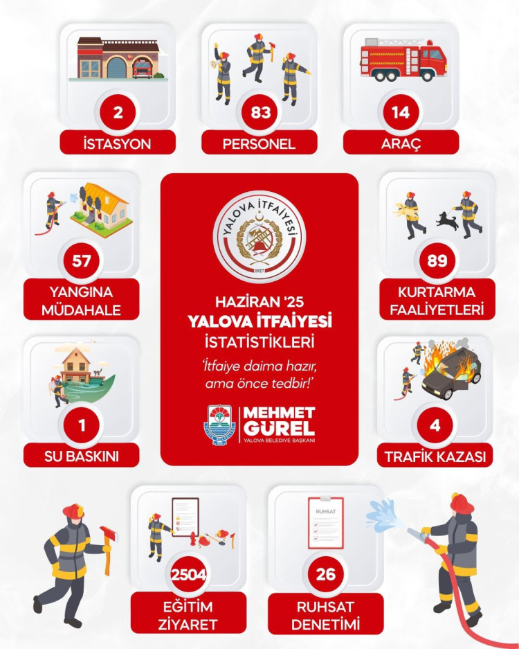 Yalova Belediyesi İtfaiye Müdürlüğü, halkın güvenliği için 7 gün 24 saat görev başında. Yalova İtfaiyesi 01-30 Haziran 2025 tarihleri arasında 151 olaya müdahale etti.