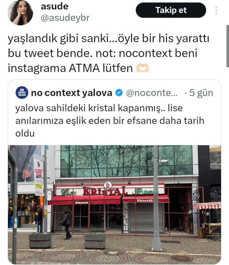Yalova’nın rekor takipçi sayısına sahip Dijital İçerik Üretici ‘No Context Yalova’ resmi hesabından konu ile ilgili yapılan paylaşımda ise “Yalova sahildeki kristal kapanmış.. lise anılarımıza eşlik eden bir efsane daha tarih oldu” ifadelerine yer verilmesi üzerine çok sayıda takipçi kendi fikirlerini de paylaştı.