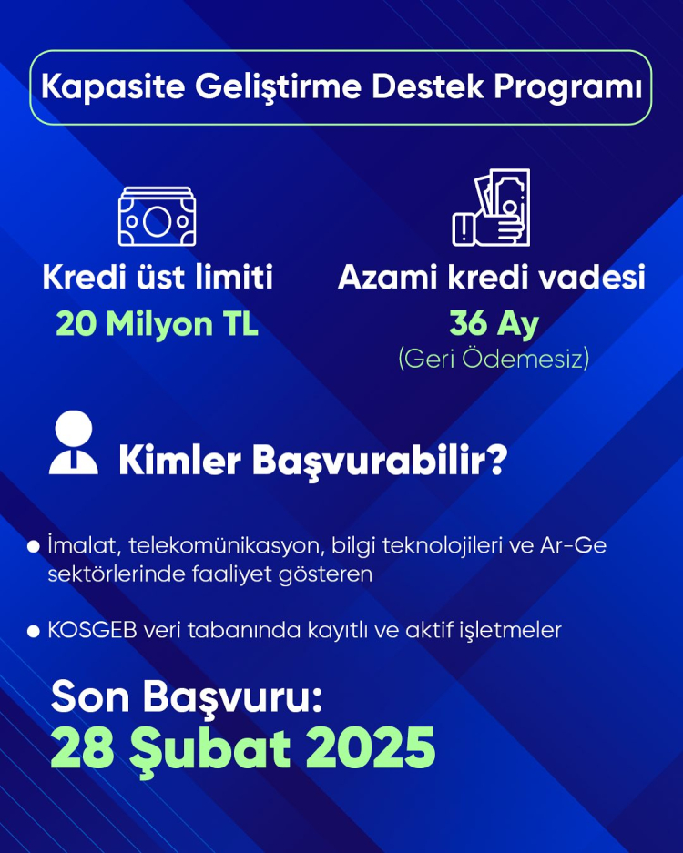 ‘’KOSGEB, işletmelerin büyümesine destek olmaya devam ediyor! Kapasite Geliştirme Destek Programı, 20 milyon TL’ye kadar kredi üst limiti ve 36 aya kadar geri ödemesiz vade imkanıyla, imalat, telekomünikasyon, bilgi teknolojileri ve Ar-Ge sektörlerinde faaliyet gösteren işletmelere büyük bir fırsat sunuyor. Başvuru için KOSGEB veri tabanında kayıtlı ve aktif işletmelerin başvuruda ön koşul olan YODA raporunu almış olması gerekiyor. Programın detayları, başvuru hakkında bilgi almak ve YODA Raporu için bizimle iletişime geçebilirsiniz: info@yalovaosb.org Son başvuru tarihi: 28 Şubat 2025 Ayrıca, ihracatını artırmayı hedefleyen, yüksek teknolojiyle faaliyet gösteren ya da TURCORN 100 Programı kapsamındaki işletmeler için Küresel Rekabetçilik Destek Programı devrede! Bu program, 50 milyon TL’ye kadar kredi desteği ve 36 aya kadar geri ödemesiz vade ile işletmelerin küresel rekabet gücünü artırmayı amaçlıyor. Son başvuru tarihi: 28 Şubat 2025.’’