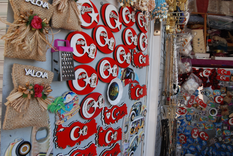 Bir yanda Türk bayrağı motifleriyle süslenmiş magnetler ve hediyelik eşyalar, diğer yanda ise rengarenk boncuklardan ve zincirlerden yapılmış takılar dikkat çekiyor.